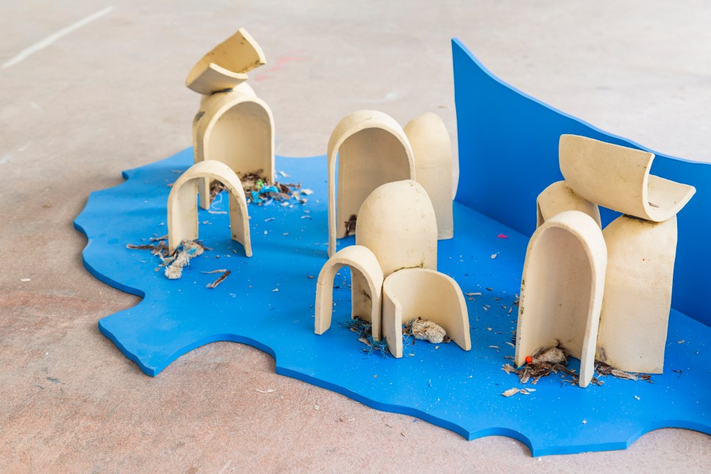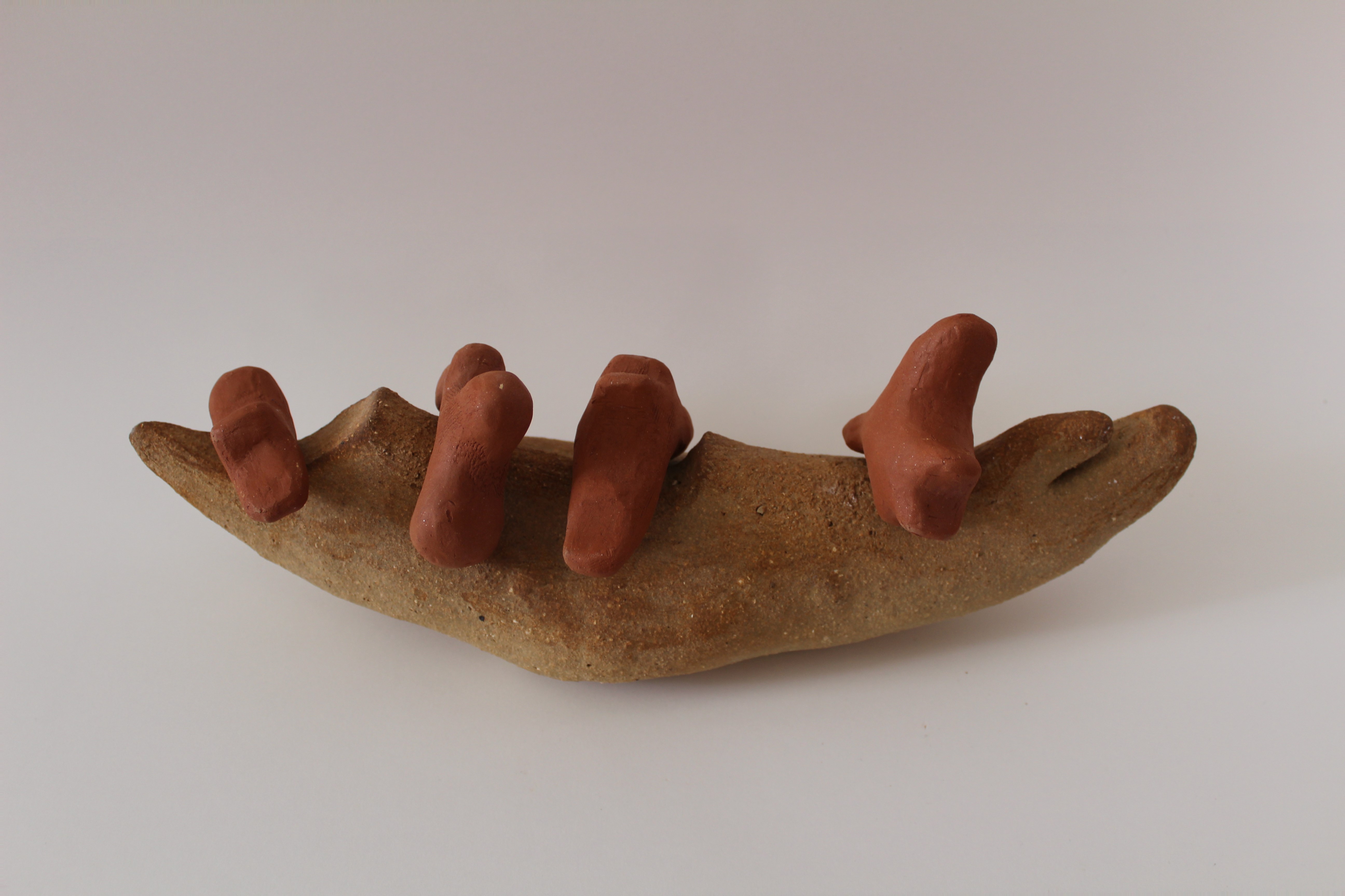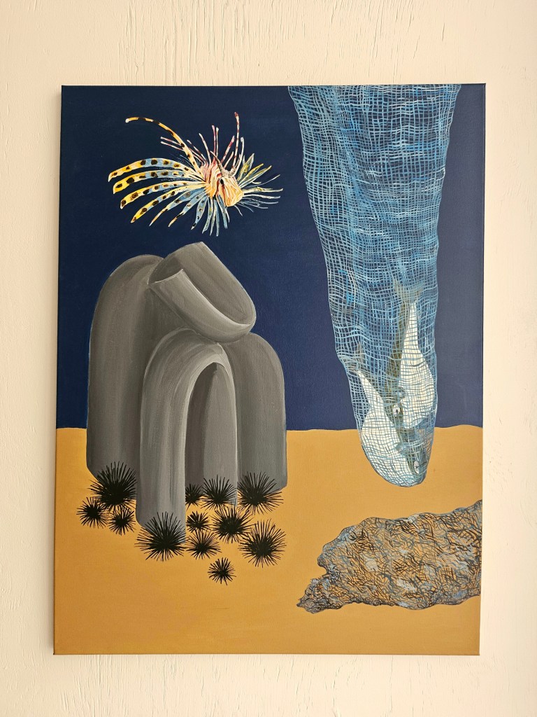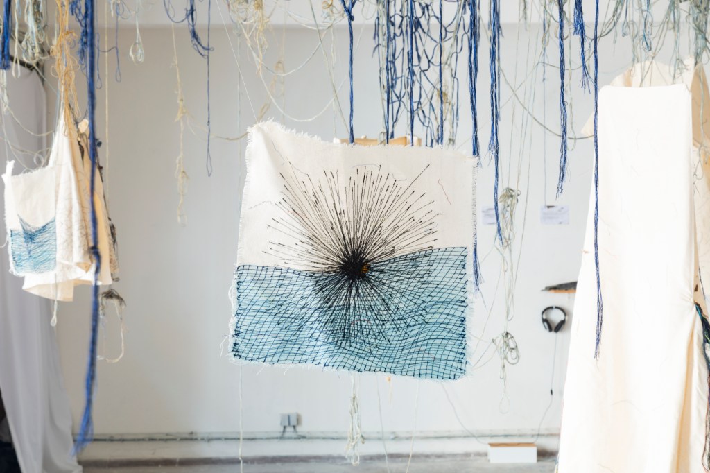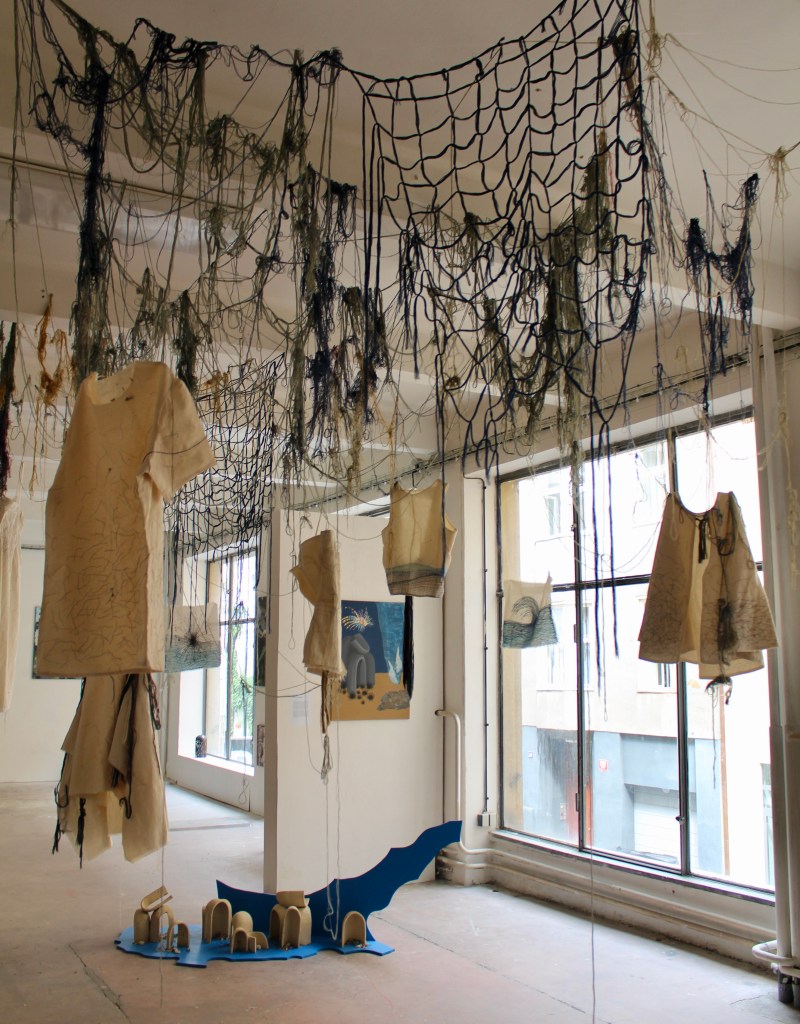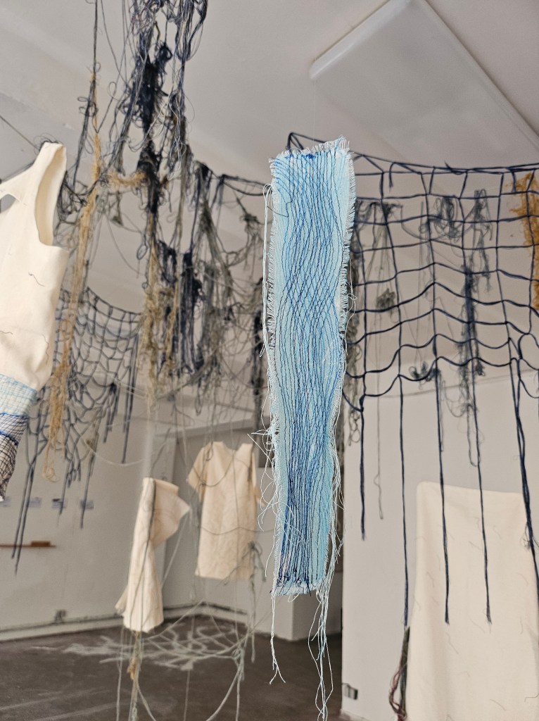The project draws on Morton’s concept of a “hyperobject”—a phenomenon too vast for human comprehension. The installation explores climate change, plastic pollution, fast fashion, and microfibers. Inspired by samples from washing machines and microscopic images, I delved into threads and fabrics, using waves of fishing nets and invasive sea urchins to create hand-crafted garments. Some pieces are complete, while others float as patterns, showcasing details like micro/macro-fibers, knotted nets, and plastic stripes. Being an islander, I incorporated seaweed, organic materials, and plastic from the beaches of Kyrenia, connecting Cyprus with Prague—a city without a sea. Ceramic works reflect ancient Cypriot heritage, highlighting borders and ongoing division. Together, these elements form an underwater world. Proje, Morton’un insan algısını aşan “hiper nesne” fikrinden ilham alıyor. Enstalasyon, iklim değişikliği, plastik kirliliği, hızlı moda ve mikrofiberlerin etkilerini ele alıyor. Çamaşır makinelerinden alınan örneklerden ve mikroskobik görüntülerden yola çıkarak iplikler ve kumaşların dünyasına daldım; dalgalar halinde balıkçı ağları ve istilacı deniz kestaneleriyle el yapımı giysiler oluşturdum. Bazı parçalar tamamlanmışken, bazıları kalıplar halinde süzülerek mikro/makro fiberler, düğümlü ağlar ve plastik şeritler gibi detayları ortaya koyuyor. Bir adalı olarak, Girne’nin sahillerinden toplanan deniz yosunu, organik materyaller ve plastiği kullanarak Kıbrıs ile deniz olmayan Prag arasında bir bağ kurmayı hedefledim. Seramikler ise Kıbrıs’ın antik mirasını, sınırlarını ve süregelen bölünmüşlüğünü yansıtıyor. Tüm bu unsurlar bir araya gelerek bir sualtı dünyasını oluşturuyor.