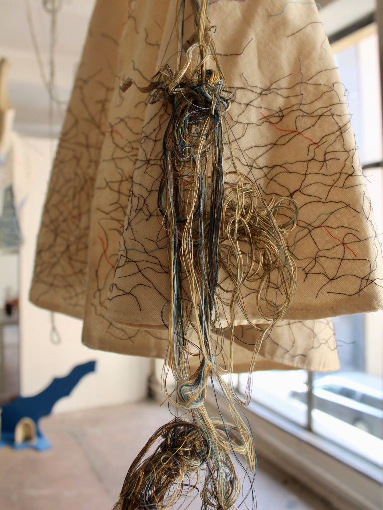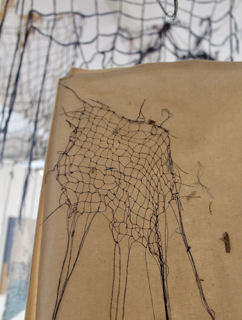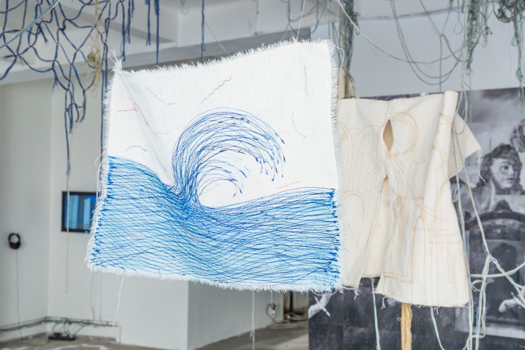 The installation explores the vastness of climate change, plastic pollution, fast fashion, and microfibers. Enstalasyon, iklim değişikliğinin genişliğini, plastik kirliliğini, hızlı modayı ve mikrofiberleri keşfetmektedir.