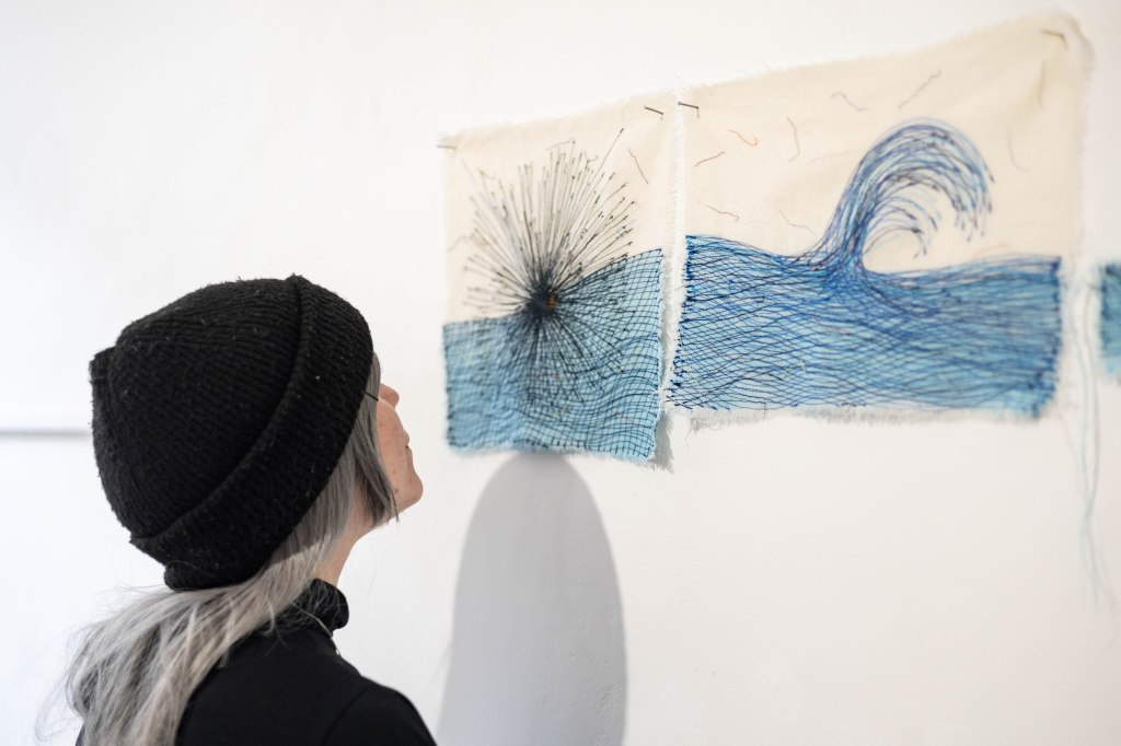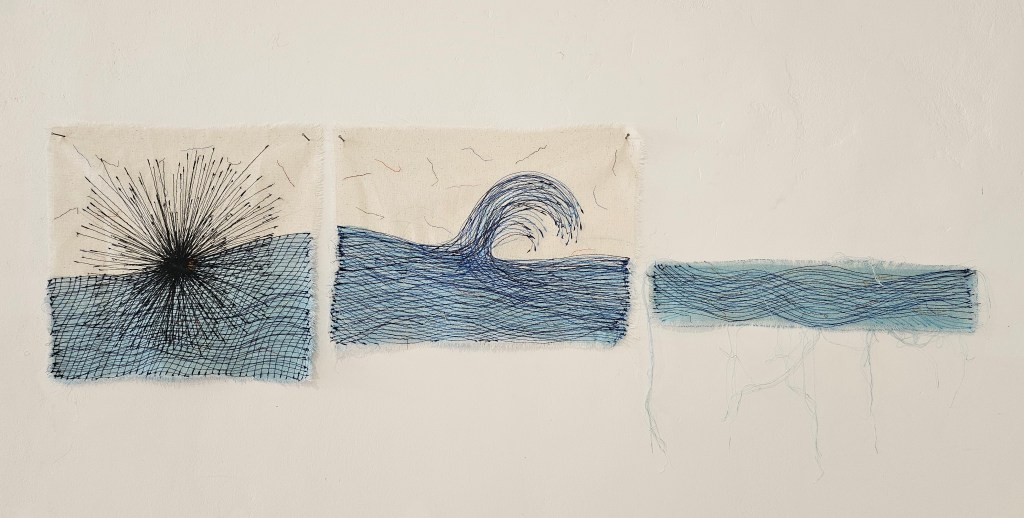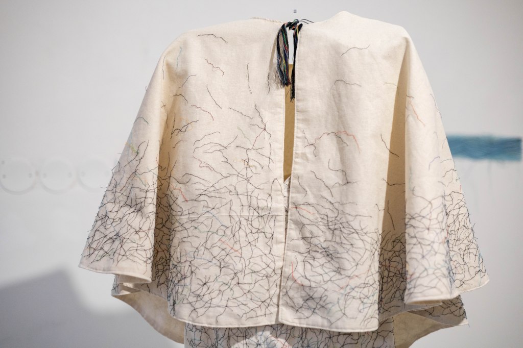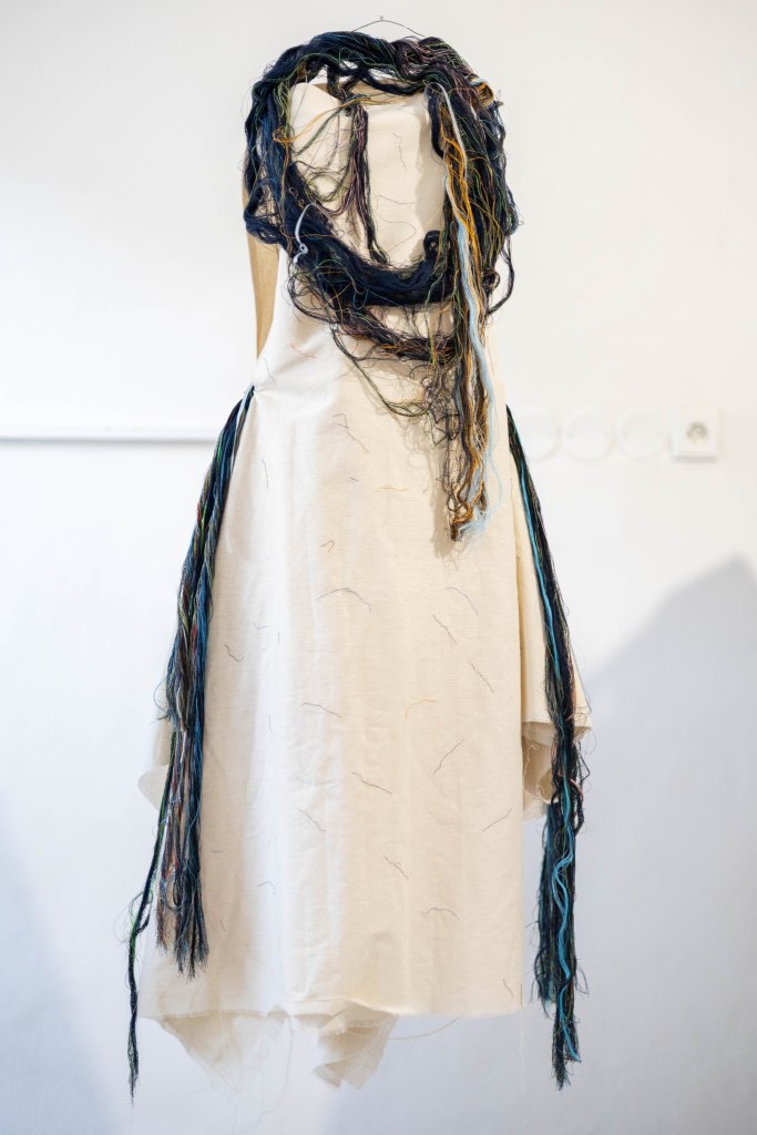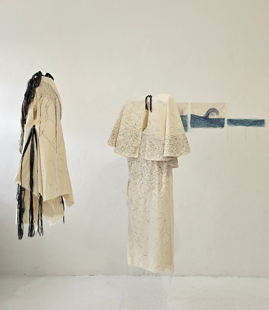 The project is inspired by samples from everyday washing machines and tiny images under a microscope, leading me to dive into the world of threads and fabrics where each stitch drew me closer to my craft.” “Morton’un ‘hiperobje’ fikrinden etkilenerek yapılan ‘Mikrofiberler’ enstelasyonu, iklim değişikliğinin, plastik kirliliğinin, hızlı modanın ve mikrofiberlerin genişliğini araştırıyor—insan anlayışının ötesinde olan bir olgu.