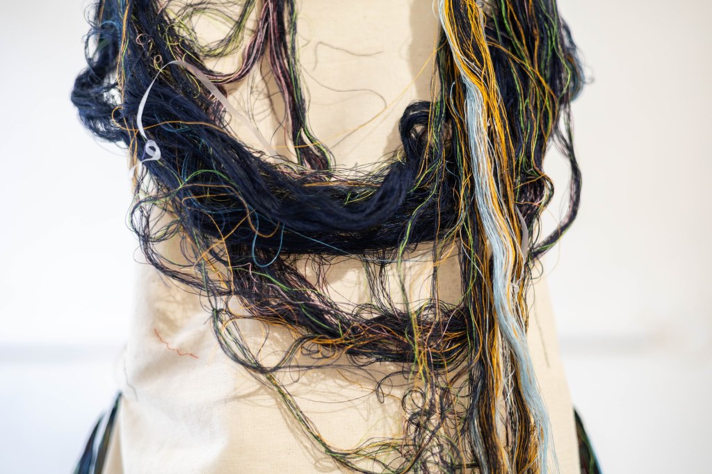 “Influenced by Morton’s idea of a “hyperobject,” the installation ‘Microfibers’ explores the vastness of climate change, plastic pollution, fast fashion, and microfibers—a phenomenon so vast that it is beyond human comprehension.